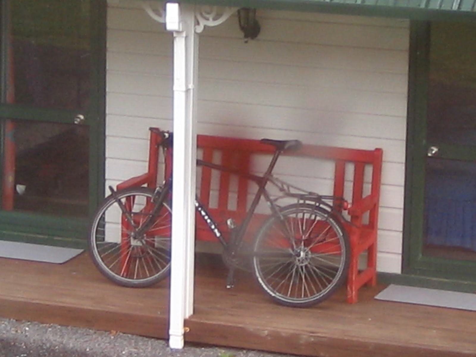 窓の外を見ると、個人用のキャビンの前に先ほどのサイクリストのバイクが見えた。